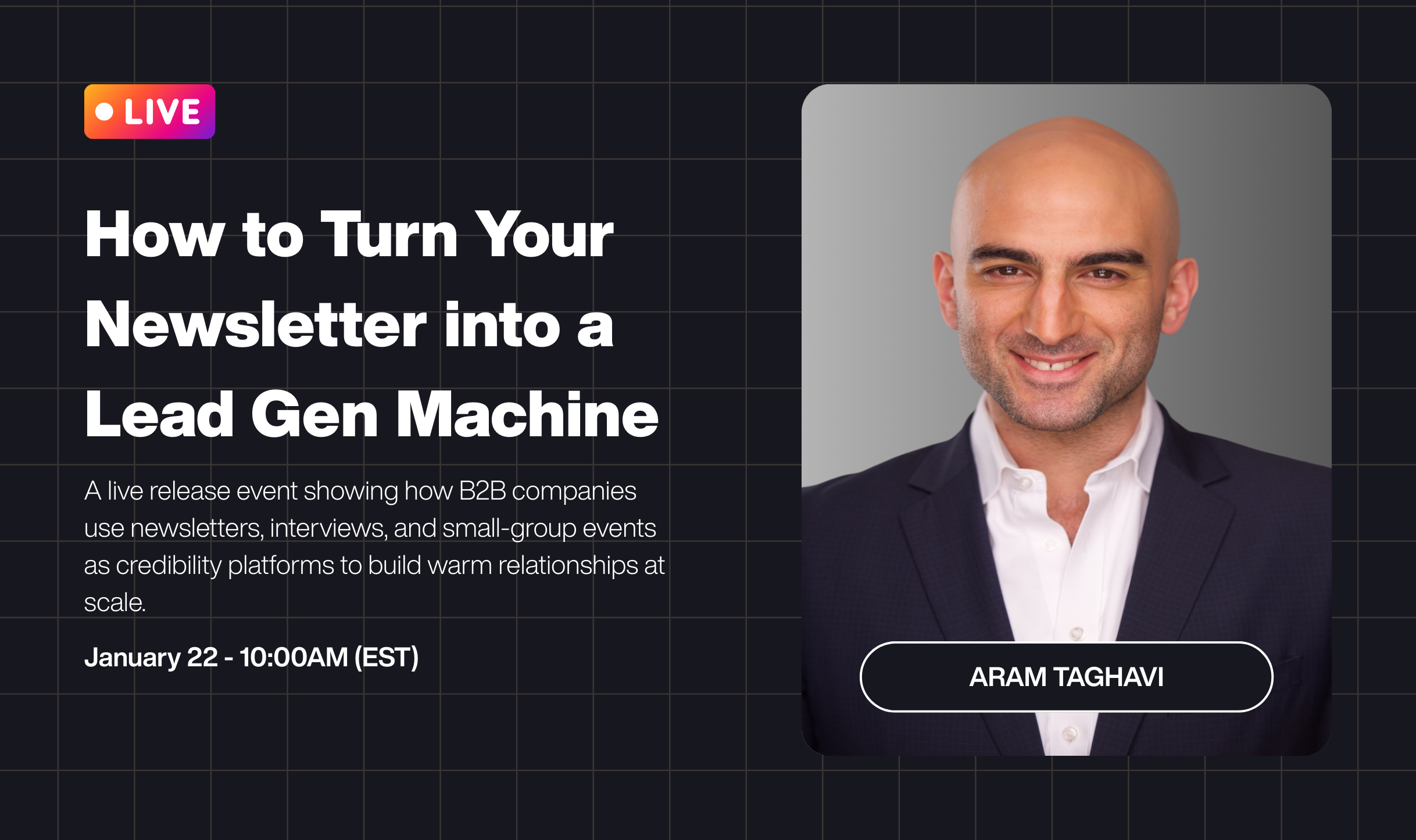 A live release event showing how B2B companies use newsletters, interviews, and small-group events as credibility platforms to build warm relationships at scale.